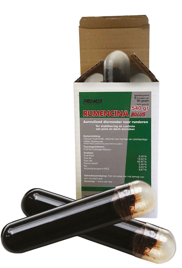 Mode d'emploi : le bolus peut être aussi bien administré avant qu'après le vêlage, en utilisant le pistolet pour bolus approprié et en comptant un bolus Rumencina de 90g / vache. Administrable en cas de balance énergétique négative, tant à la fin de la période de tarissement qu'au début de lactation ou en cas d'acidose.